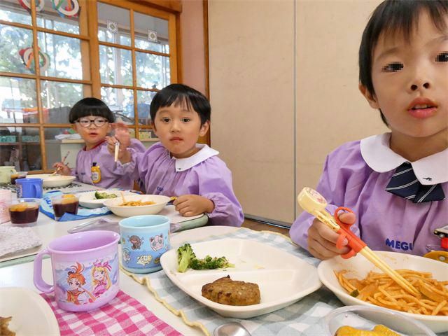 ◎写真の右上はハロウィンパンプキンの形をしたハンバーグです。