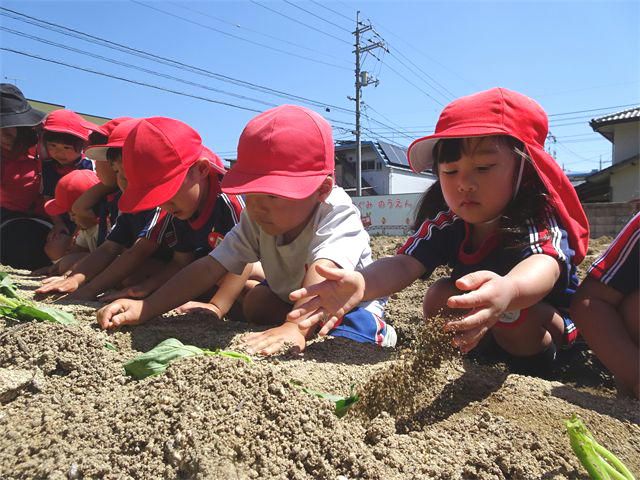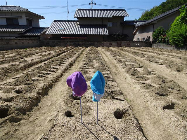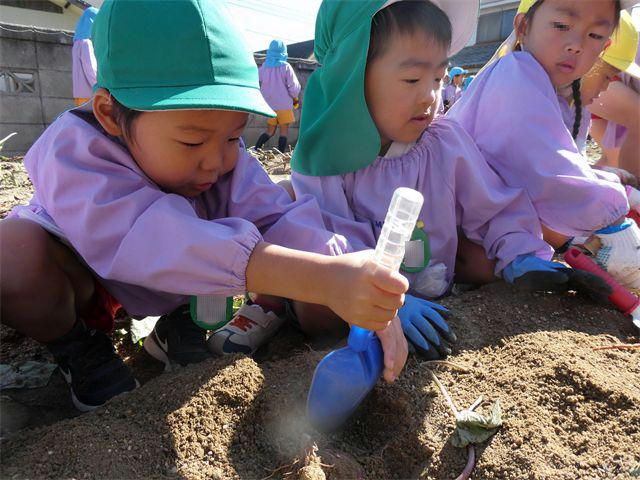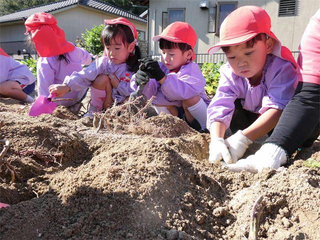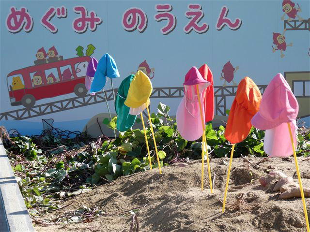 ◎サツマイモの苗は去る6月5日(木)に年少・年中・年長組の3学年で植え付けました。